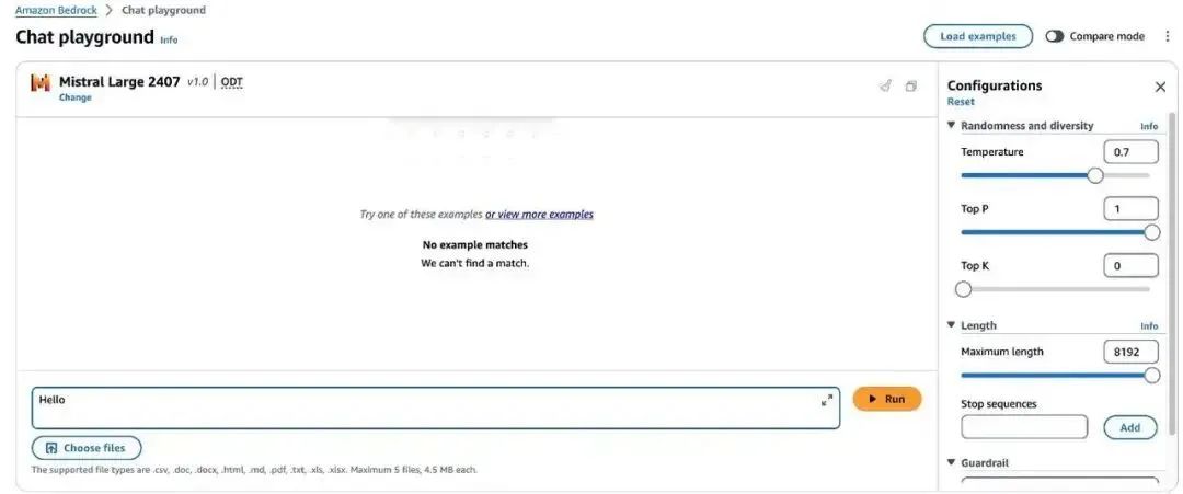要在 Amazon Bedrock 控制台上测试 Mistral Large 2,请在导航窗格中选择“Playgrounds”,然后选择“Text”或“Chat”。接下来选择“Select model”,将类别选择为“Mistral”并将模型选择为“Mistral Large 24.07”。