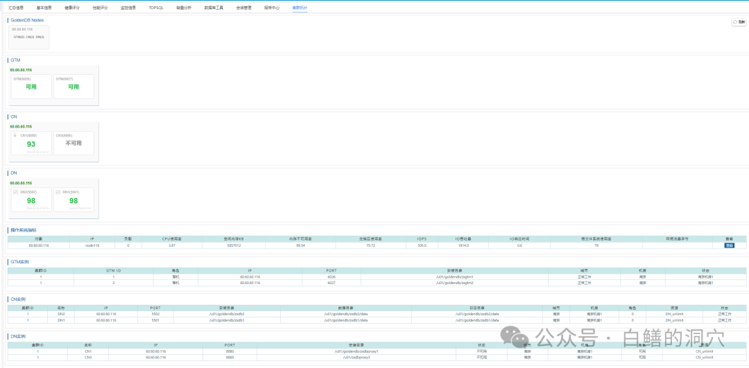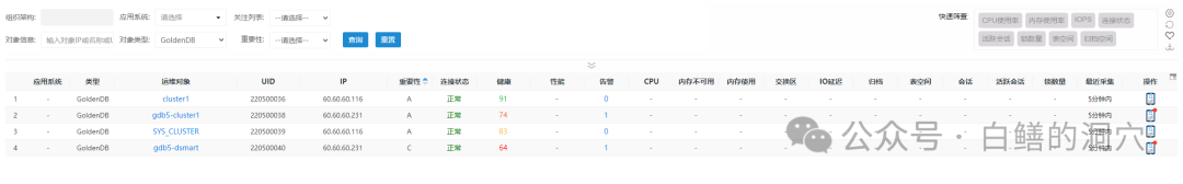用户提出GoldenDB纳管的需求已经很久了,最近我们终于准备在V2.7版本中提供对GoldenDB的支持了。迟迟没有完成GoldenDB纳管的主要原因是因为排期的问题以及和客户与原厂一起探讨如何高效、无害地采集D-SMART所需要的数据,因为D-SMART是一种“运维知识自动化系统”,而不是简单的监控系统,需要采集大量的可观测性数据,才能完成各种模型的建模,并开发相关的诊断工具。目前D-SMART已经定义了600多个监控指标,通过这六百多个指标计算出来的300多个指标将会被用于故障预警、自动化巡检、根因分析、容量管理等运维领域。
