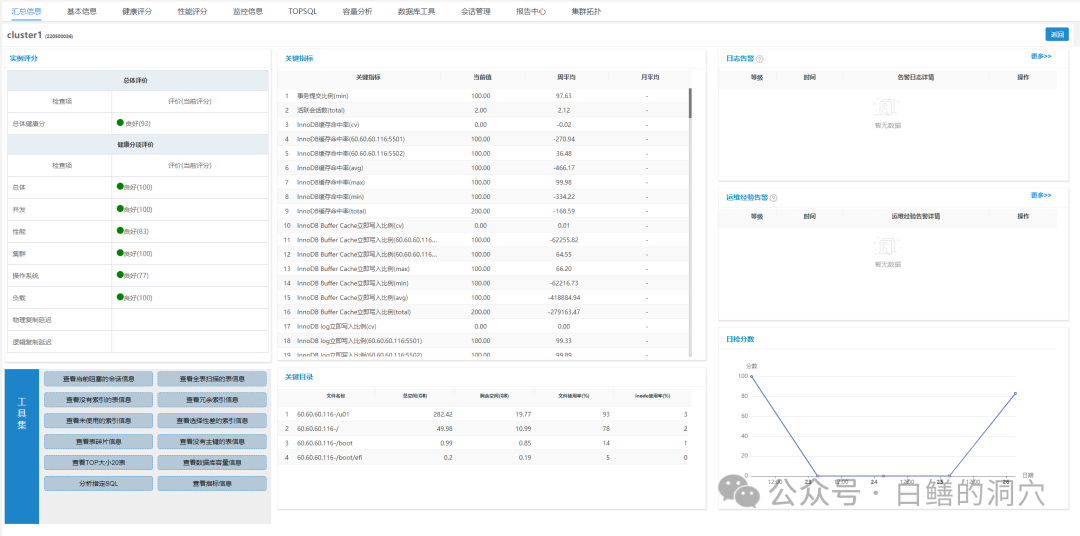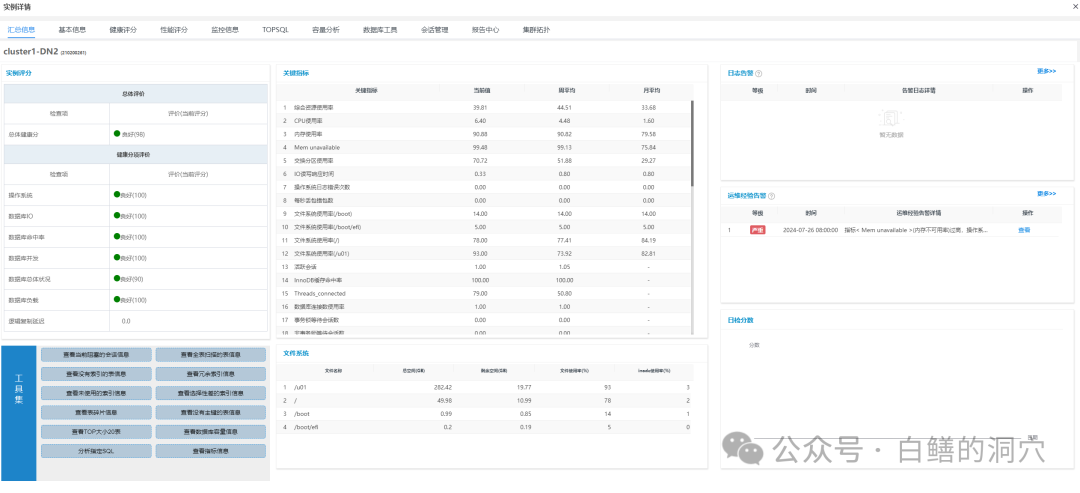 下周我们将会完成BETA版的封板,并在一个金融用户的测试环境中开展深度对接。健康模型、关键指标、常用工具、日检等功能都已经完成。日检功能是基于GDB官方文档《GoldenDB分布式数据库例行维护手册》中的相关内容编制的,目的是让这些工作能够周期性的自动化完成。