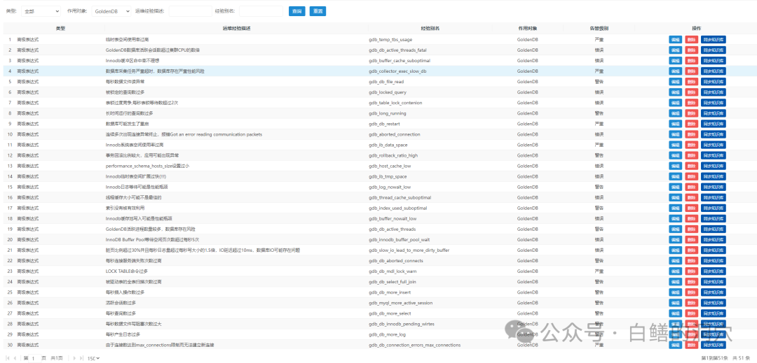 通过对GDB官方文档的学习,我们目前在GDB集群上构建了51条故障模型,这当然是闭门造车的结果,是否有效,必须在实际生产环境中去做验证,并从实际生产环境中不断提炼新的故障模型。加上三十多条通用故障模型,在GDB的运维经验模板中已经有80多条运维经验了。