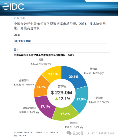 说了这么多,OceanBase说自己是金融关键业务系统,本地部署第一,有没有根据,有没有人给它背书,我们看下面IDC 的市场份额分析的截图,把云厂商排除出去,OceanBase就是第一,而且是自由第一。