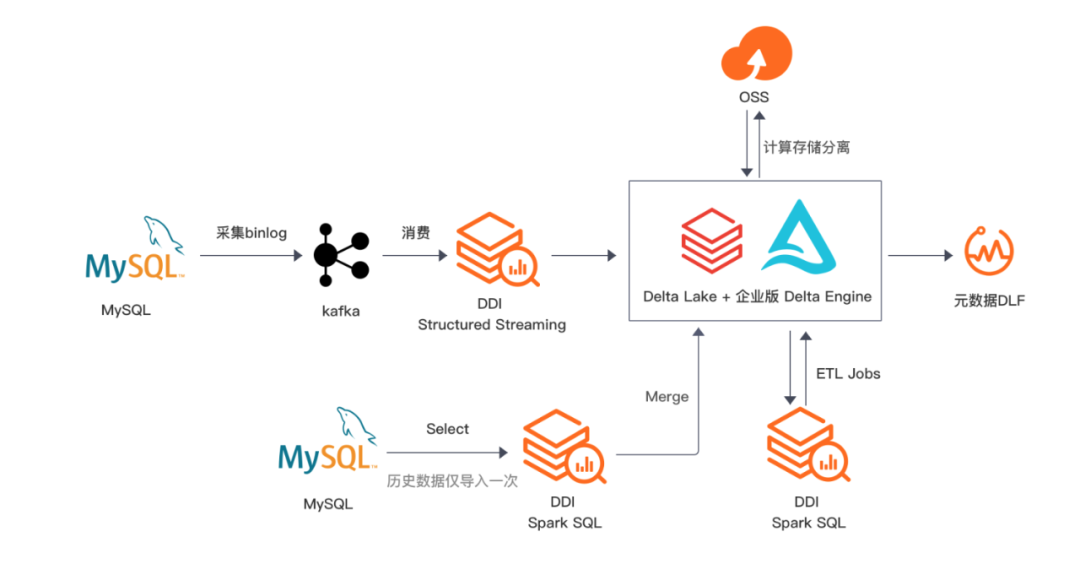 整体的架构如上图所示。我们接入的数据会分为两部分,存量历史数据和实时数据,存量数据使用 Spark 将 MySQL 全量数据导入 Delta Lake 的表中, 实时数据使用 Binlog 采集实时写入到 Delta Lake 表中,这样实时数据和历史数据都同步到同一份表里面真正实现批流一体操作。