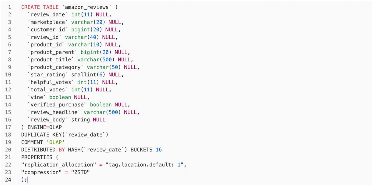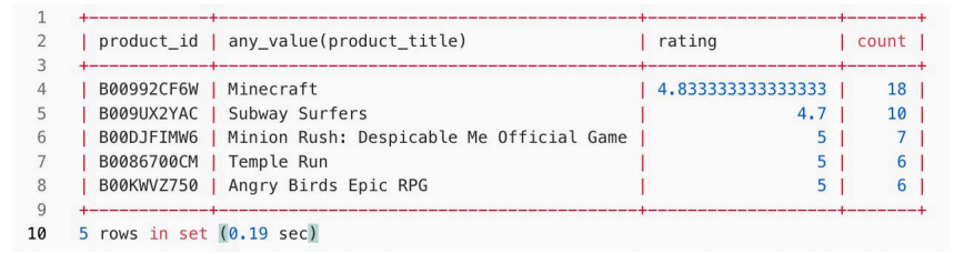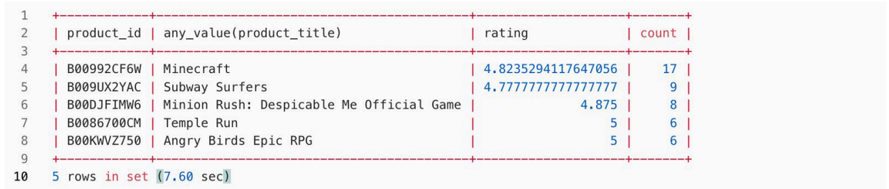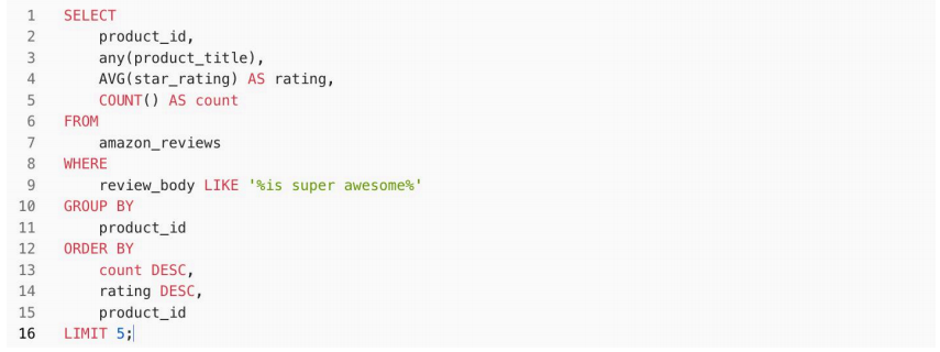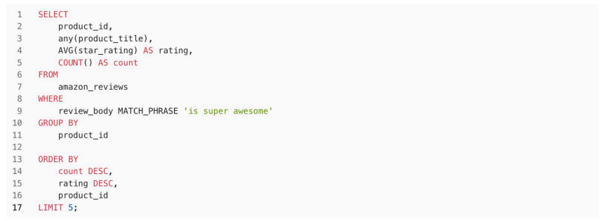 环境及数据准备就绪后,我们尝试对 review_body 列进行文本搜索查询。具体需求是在数据集中查出评论中包含" is super awesome "关键字的前5种产品,并按照评论数量降序排列,查询结果需显示每种产品的 ID、随机一个产品标题、平均星级评分以从及评论总数。review_body 列的特征是评论内容比较长,因此进行文本搜索会有一定的性能压力。