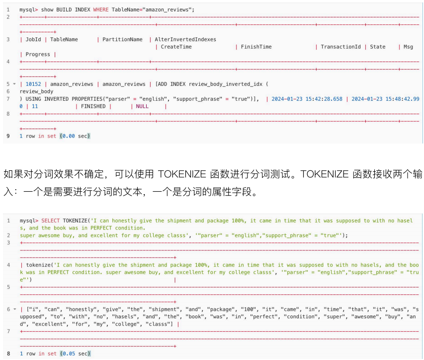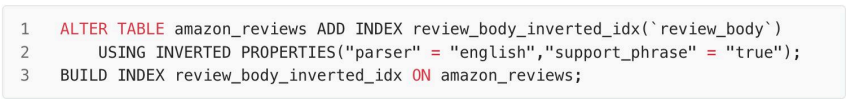 1.新增倒排索引:对 amazon_reviews 表的 review_body 列※添加倒排索引,该索引采用英文分词,并支持 Phrase 短语查询,短语查询即进行文本搜索时,分词后的词语顺序将会影响搜索结果。