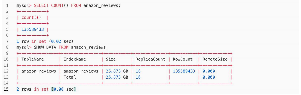 4.查看与验证:完成上述步骤后,可以在MySQL客户端执行!以下语句,来查看导入的数据行数和所占用空间。从下方代码可知:共导入135589433行数据,在Doris中占用空间25.873GB,比压缩后的 Parquet 列式存储进一步降低了30%。