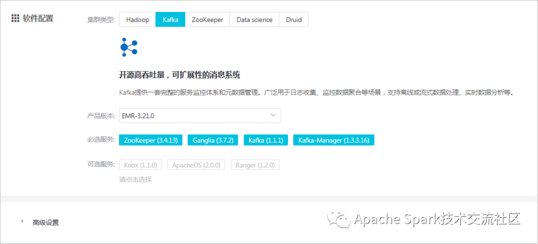 在EMR上创建源Kafka集群和目的Kafka集群。Kafka Connect安装在Task节点上,所以目的Kafka集群必须创建Task节点。集群创建好后,Task节点上Kafka Connect服务会默认启动,端口号为8083。