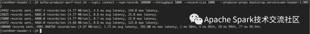 kafka-producer-perf-test.sh --topic connect --num-records 100000 --throughput 5000 --record-size 1000 --producer-props bootstrap.servers=emr-header-1:9092