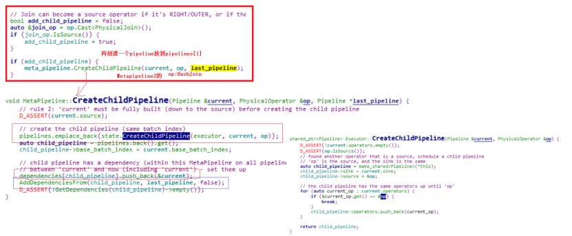 9)接着会添加依赖,都是在CreateChildPipeline函数中完成。对于当前的metapipeline,即MetaPipeline2它有两个pipeline:pipeline[0]:probe端;pipeline[1]:child pipeline。首先将当前pipeline(pipeline[0])放到dependencies[child_pipeline]中;然后调用AddDependenciesFrom(child_pipeline, last_pipeline, false)继续添加依赖关系,从last_pipeline开始继续向dependencies中添加。