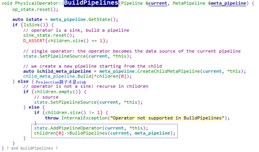 5)紧接着使用child_meta_pipeline继续构建pipeline。下一个算子是PROJECTION:PhysicalProjection,它没有重写基类的BuildPipelines,那么就调用PhysicalOperator的BuildPipelines: