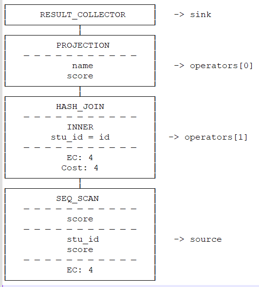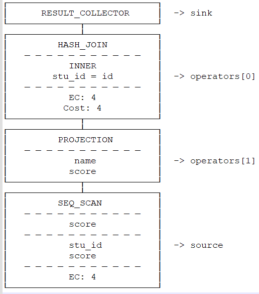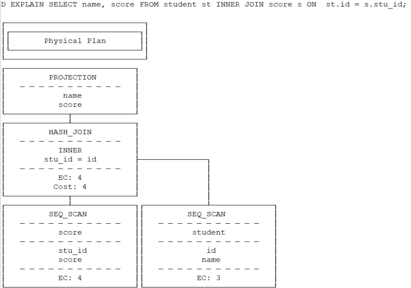 };让我们看一个简单inner join的例子:物理执行计划最上头是投影算子PROJECTION,然后其左子树是HASH_JOIN算子,HASH_JOIN两个子算子分别为两个顺序扫描SEQ_SCAN: