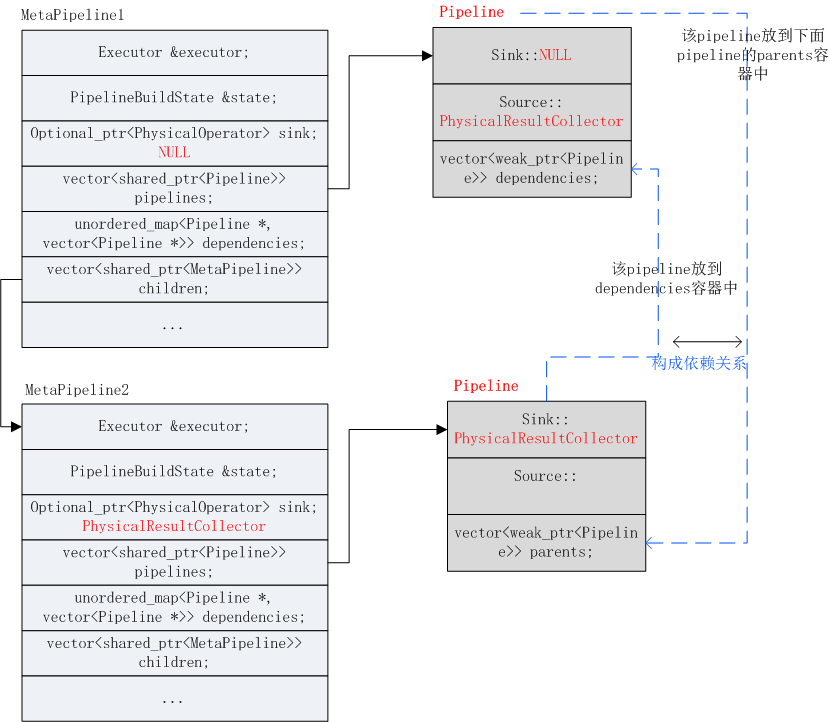 1)最开始由Executor::InitializeInteral函数创建一个MetaPipeline。该MetaPipeline的sink为NULL,vector<>pipelines容器创建一个pipeline,该pipeline的sink为NULL。