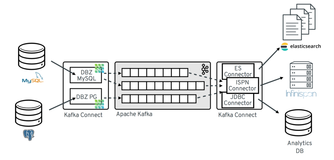 既然捕获更改事件的数据位于 Apache Kafka 中,那么我们就可以使用来自 Kafka Connect 生态系统的各种 Connector 将 CDC 数据传输到其他系统和数据库,比如 Elasticsearch、数据仓库和分析系统或缓存。