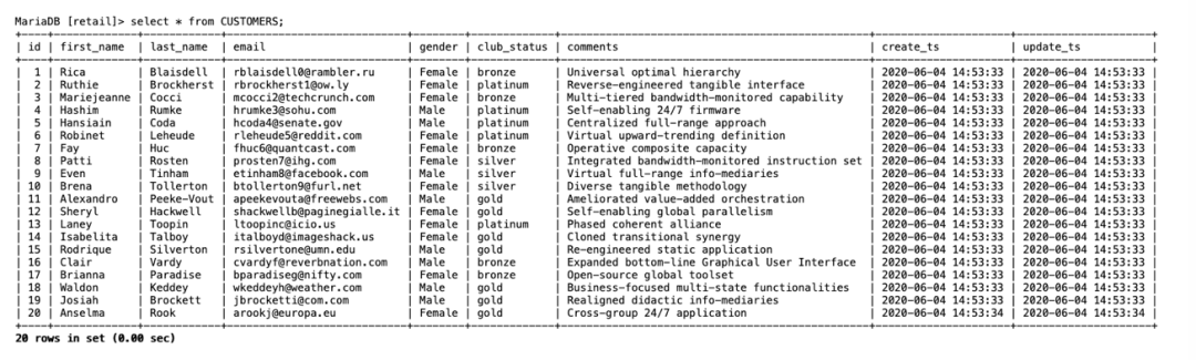 MariaDB [retail]> SELECT ID, FIRST_NAME, LAST_NAME, CLUB_STATUS FROM CUSTOMERS LIMIT 5;+----+-------------+------------+-------------+| ID | FIRST_NAME | LAST_NAME | CLUB_STATUS |+----+-------------+------------+-------------+| 1 | Rica | Blaisdell | bronze || 2 | Ruthie | Brockherst | platinum || 3 | Mariejeanne | Cocci | bronze || 4 | Hashim | Rumke | platinum || 5 | Hansiain | Coda | platinum |+----+-------------+------------+-------------+5 rows in set (0.00 sec)