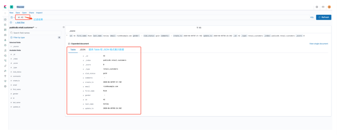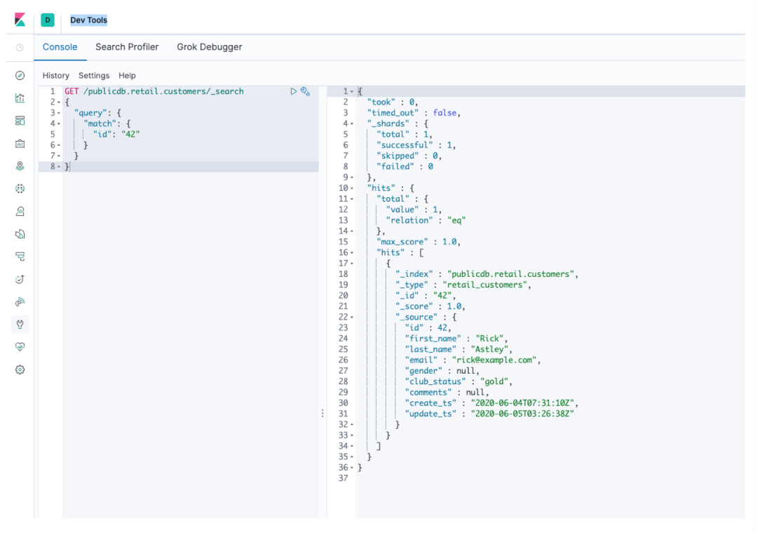 curl -u elastic:elastic 'http://es101.dataflow.com:9200/publicdb.retail.customers/_search?pretty'# 输出结果(省略 x 行字){"took" : 0,"timed_out" : false,"_shards" : {"total" : 1,"successful" : 1,"skipped" : 0,"failed" : 0},"hits" : {"total" : {"value" : 23,"relation" : "eq"},"max_score" : 1.0,"hits" : [{"_index" : "publicdb.retail.customers","_type" : "retail_customers","_id" : "1","_score" : 1.0,"_source" : {"id" : 1,"first_name" : "Rica","last_name" : "Blaisdell","email" : "rblaisdell0@rambler.ru","gender" : "Female","club_status" : "bronze","comments" : "Universal optimal hierarchy","create_ts" : "2020-06-04T19:53:33Z","update_ts" : "2020-06-04T19:53:33Z"}},...{"_index" : "publicdb.retail.customers","_type" : "retail_customers","_id" : "42","_score" : 1.0,"_source" : {"id" : 42,"first_name" : "Rick","last_name" : "Astley","email" : "rick@example.com","gender" : null,"club_status" : "gold","comments" : null,"create_ts" : "2020-06-04T07:31:10Z","update_ts" : "2020-06-05T03:26:38Z"}},...]}}