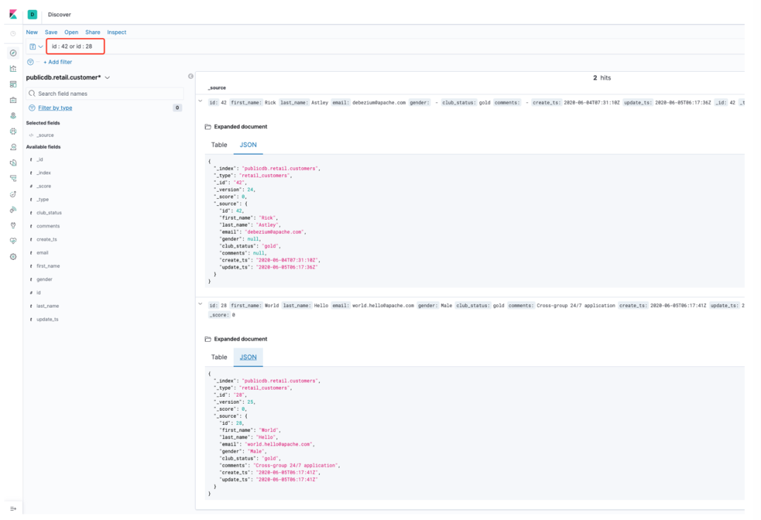 ..."payload": {"before": {"id": 42,"first_name": "Rick","last_name": "Astley","email": "rick@example.com","gender": null,"club_status": "platinum","comments": null,"create_ts": "2020-06-04T07:31:10Z","update_ts": "2020-06-04T07:31:24Z"},"after": {"id": 42,"first_name": "Rick","last_name": "Astley","email": "rick@example.com","gender": null,"club_status": "gold","comments": null,"create_ts": "2020-06-04T07:31:10Z","update_ts": "2020-06-05T03:26:38Z"},"source": {"version": "1.1.0.Final","connector": "mysql","name": "publicdb","ts_ms": 1591327598000,"snapshot": "false","db": "retail","table": "CUSTOMERS","server_id": 300,"gtid": null,"file": "master-bin.002782","pos": 593922869,"row": 0,"thread": 0,"query": null},"op": "u","ts_ms": 1591327542863,"transaction": null}}