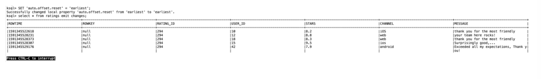 ksql> SET 'auto.offset.reset' = 'earliest';Successfully changed local property 'auto.offset.reset' from 'earliest' to 'earliest'.ksql> select * from ratings emit changes;...