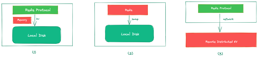 基于磁盘 KV 存储引擎(比如 RocksDB/LevelDB) 实现 Redis 协议 基于 Redis 存储之上将冷数据交换到磁盘(类似早期 Redis VM 的方案) 基于分布式 KV(比如 TiKV) 实现 Redis 协议代理,本地不做存储