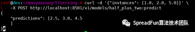 curl -d'{"instances": [1.0, 2.0, 5.0]}' \-X POST http://localhost:8501/v1/models/half_plus_two:predict