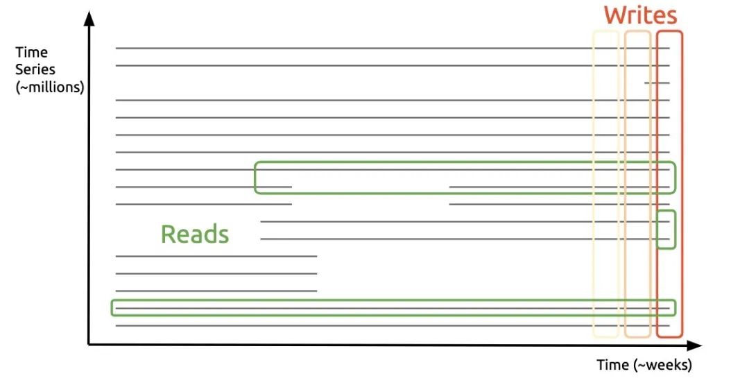 时序数据的特点可以用一话概括:垂直写(最新数据),水平查。