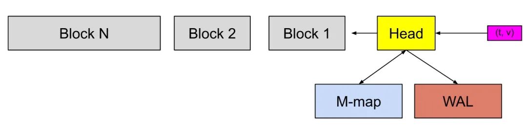 当前正在写入的,称为 head。当超过 2 小时或超过 120 个点时,head 会将 chunk 写入到本地磁盘中,并使用 mmap 映射到内存中,保存在下文的 mmappedChunk 中。