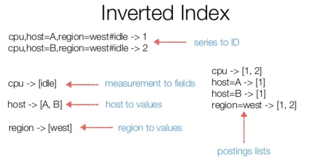 索引是支持多维搜索的主要手段,时序中的索引结构和搜索引擎的类似,是个倒排索引,可参考下图