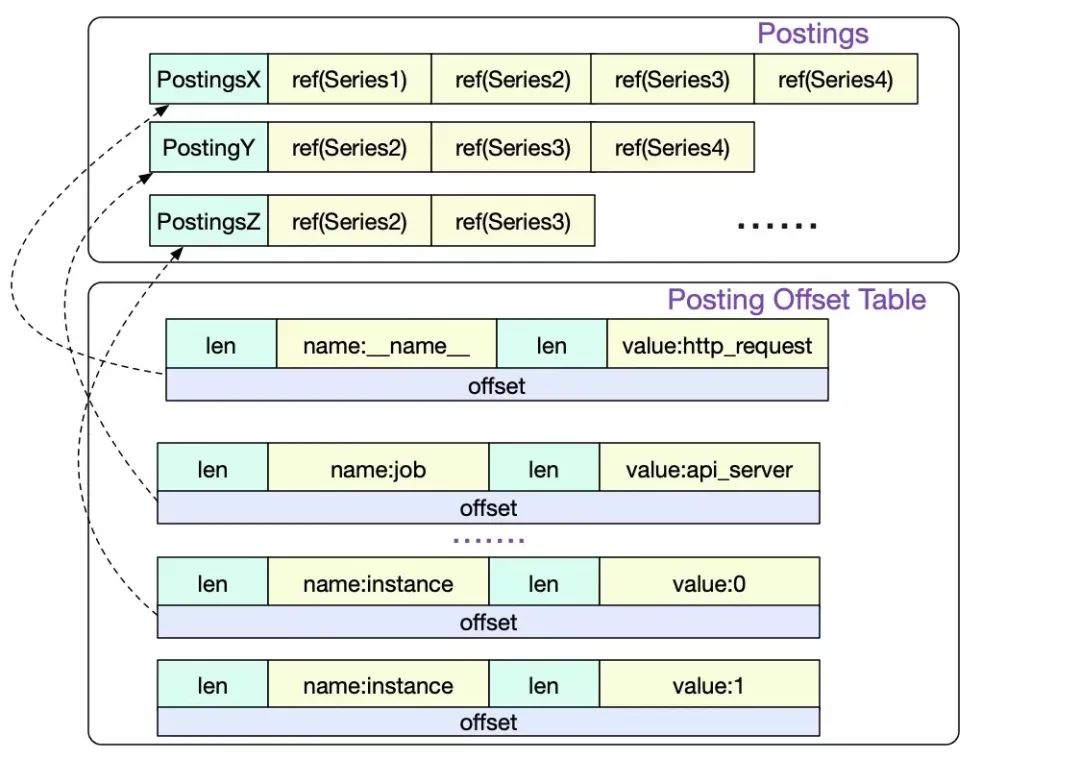 Postings Offset Table,用来存储倒排索引,Key 为 label name/value 序对,Value 为 Postings 在文件中的 offset。