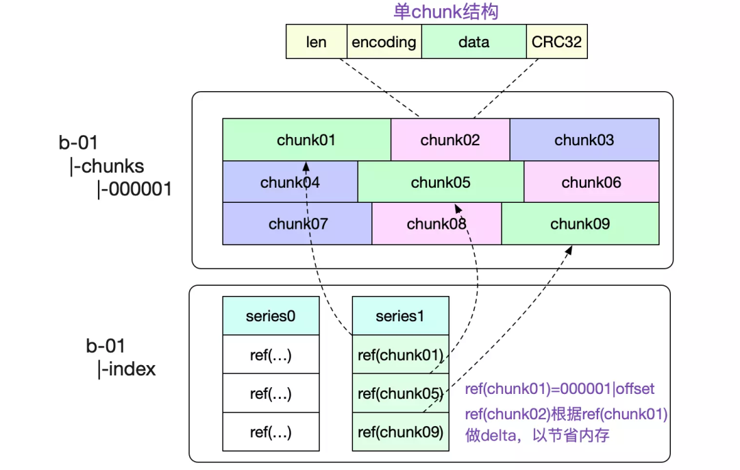 ┌──────────────────────────────┐│ magic(0x0130BC91) <4 byte> │├──────────────────────────────┤│ version(1) <1 byte> │├──────────────────────────────┤│ padding(0) <3 byte> │├──────────────────────────────┤│ ┌──────────────────────────┐ ││ │ Chunk 1 │ ││ ├──────────────────────────┤ ││ │ ... │ ││ ├──────────────────────────┤ ││ │ Chunk N │ ││ └──────────────────────────┘ │└──────────────────────────────┘# 单个 chunk 内的结构┌─────────────────────┬───────────────────────┬───────────────────────┬───────────────────┬───────────────┬──────────────┬────────────────┐| series ref <8 byte> | mint <8 byte, uint64> | maxt <8 byte, uint64> | encoding <1 byte> | len <uvarint> | data <bytes> │ CRC32 <4 byte> │└─────────────────────┴───────────────────────┴───────────────────────┴───────────────────┴───────────────┴──────────────┴────────────────┘