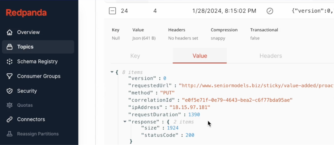 在演示的Docker Compose栈中会启动一个Redpanda容器,以及一个数据生成器和Redpanda控制台,方便你轻松地探索实时数据。例如,访问http://localhost:8080,你将看到owlshop-frontend-events主题中的实时数据。
