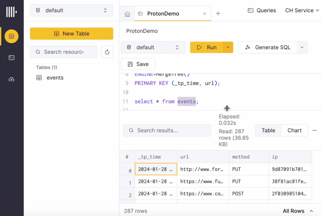 CREATE TABLE events(_tp_time DateTime64(3),url String,method String,ip String)ENGINE=MergeTree()PRIMARY KEY (_tp_time, url);