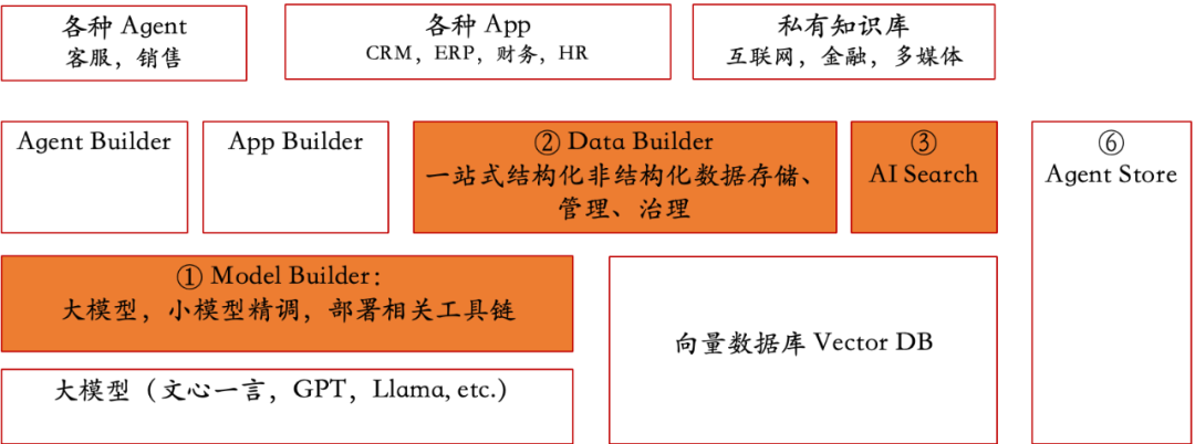下面这个图就是当时介绍的技术栈,主要 PaaS 这块是 6 大块组成,包括大模型,Model Builder,向量数据库,Agent Builder,App Builder,Agent Store这 6 部分组成。大家可以先翻一翻前面的文章回忆一下。
