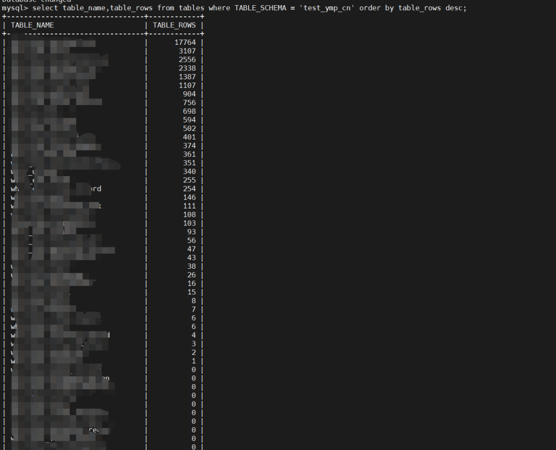 select count(*) from tables where TABLE_SCHEMA = 'test_ymp_cn';select table_name,table_rows from tables where TABLE_SCHEMA = 'test_ymp_cn' order by table_rows desc;
