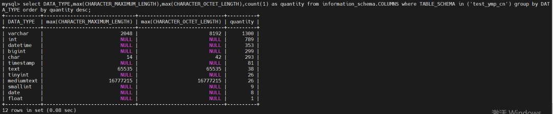 select DATA_TYPE,max(CHARACTER_MAXIMUM_LENGTH),max(CHARACTER_OCTET_LENGTH),count(1) as quantity from information_schema.COLUMNS where TABLE_SCHEMA in ('test_ymp_cn') group by DATA_TYPE order by quantity desc;