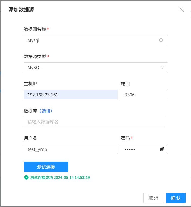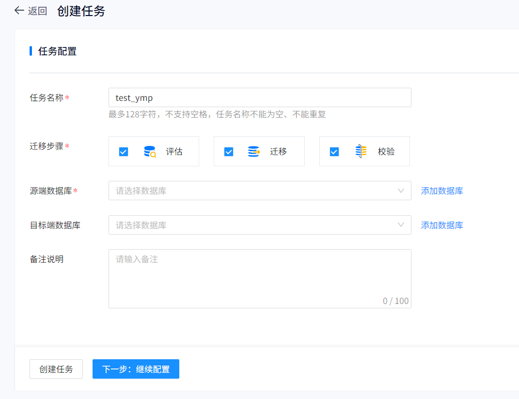 在源端数据库和目标端数据库的右侧点击添加数据库,填写一系列连接数据库所需的