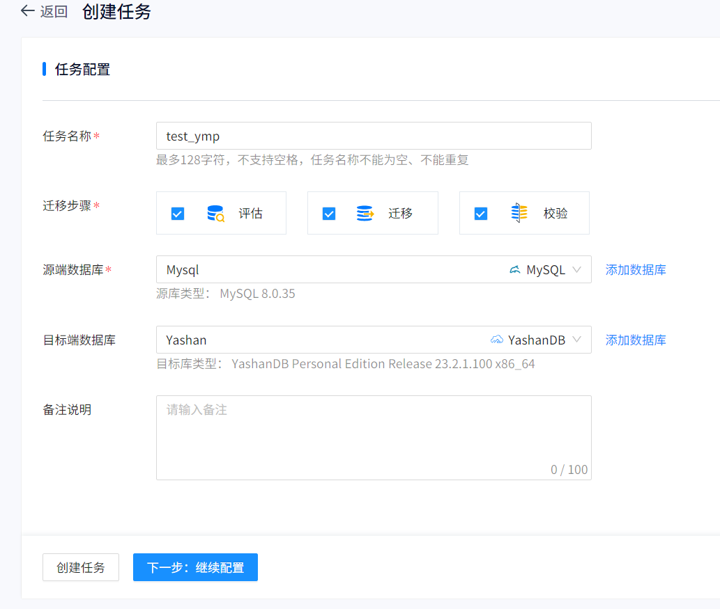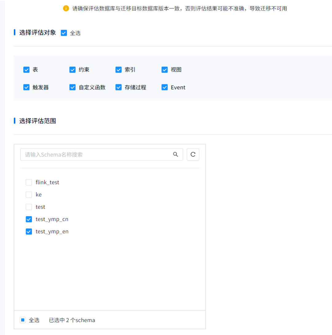 评估范围则选择要迁移的两个database:test_ymp_cn和test_ymp_en。