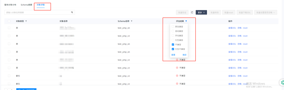 点到对象详情那边,筛选出不兼容的项,看看到底是怎么回事儿。