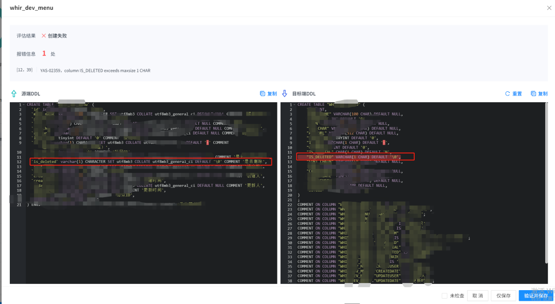 可以看到不兼容的信息,根据实际业务情况决定要不要调整SQL,我这里遇见的情况是MySQL端的一个默认值无法插入到YashanDB的数据库中,所以修改了默认值。