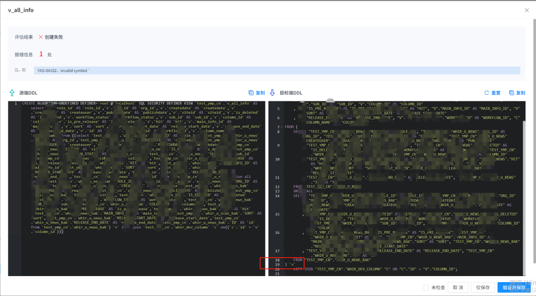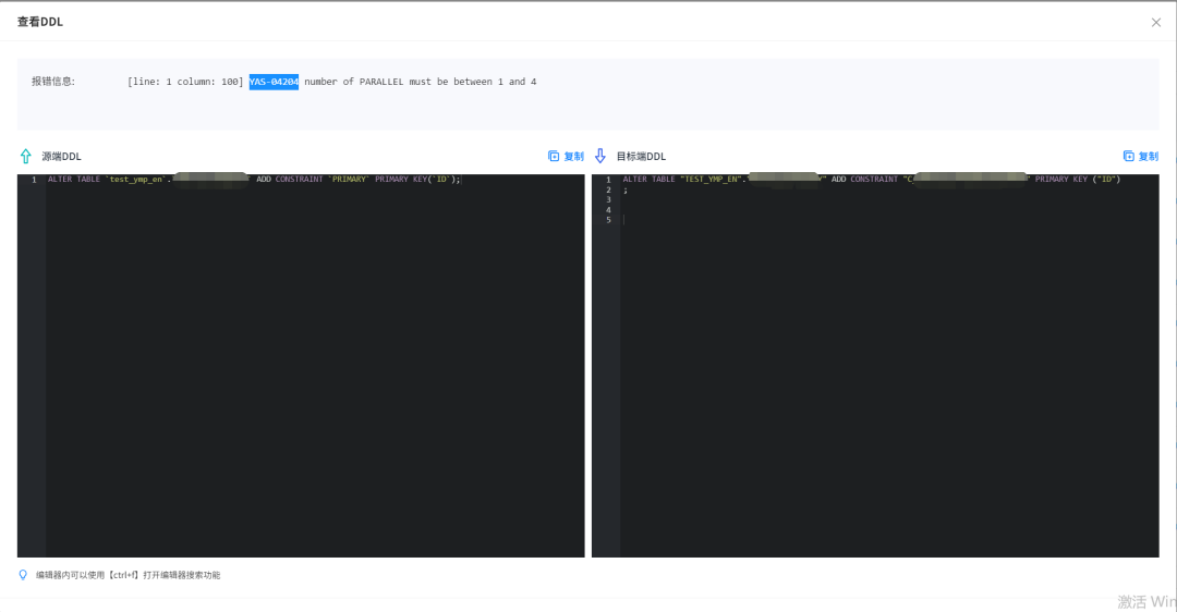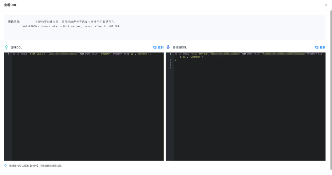 然后发现这个报错,好像,看不懂…而且目标端的DDL在数据库又是可以实际执行成功的,而且用ymp点击重试也不能修复,尴尬了。
