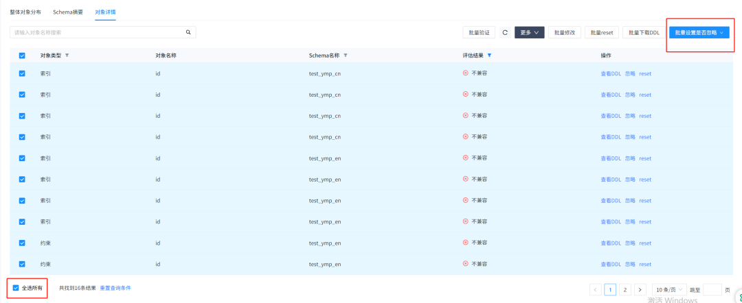剩下的索引和约束不兼容,大部分是因为MySQL可以在同一列上创建多个索引,但是YashanDB不允许这样操作导致的。检查完剩下的索引和约束都是这种报错后,全部选中并点击批量忽略。