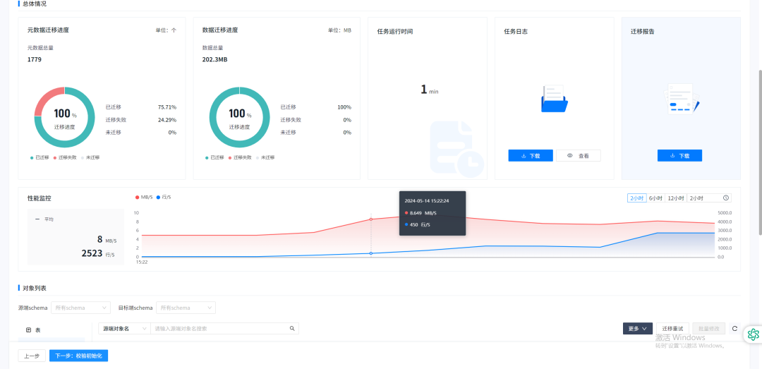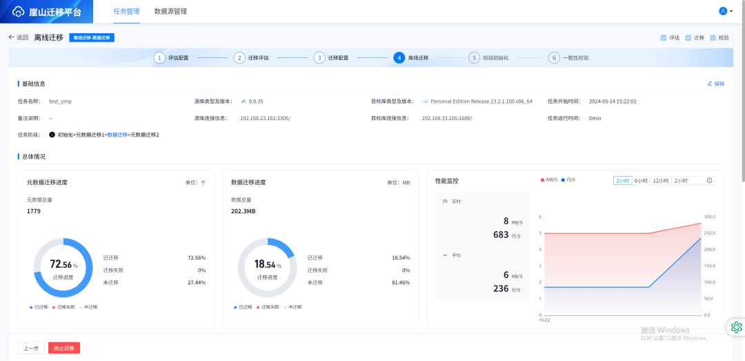 点击开始迁移后,会弹出一个字符集不兼容的告警,不管他,直接开始迁移。