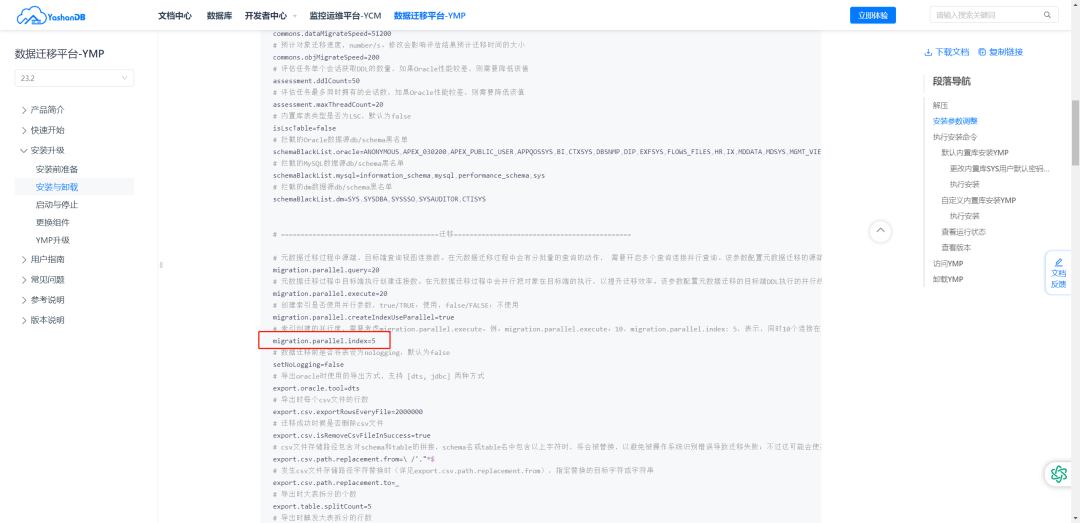 又回去翻YMP的官方文档,终于在安装这一章节的配置文件这里,找到migration.parallel.index这个参数。