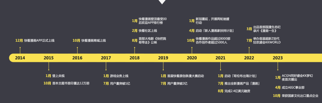 快看漫画创办于2014年,集漫画阅读、创作互动、线下漫画沉浸体验、周边衍生品购买等体验于一体,是年轻人的一站式漫画生活方式平台。截止到2023年底,快看总用户超过3.8亿,在中国漫画市场渗透率超过50%。经过9年的创作者生态建设,快看已汇聚超过12万注册创作者,发表漫画作品超13000部。目前,快看漫画已有超过500部作品登陆全球近200个国家和地区,成为中国文化出海的代表。