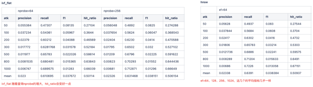 hnsw在不同@k下的平均召回率都要好于 ivf_flat,这个是业务上更加关心的点,所以后面就切到了HNSW索引。