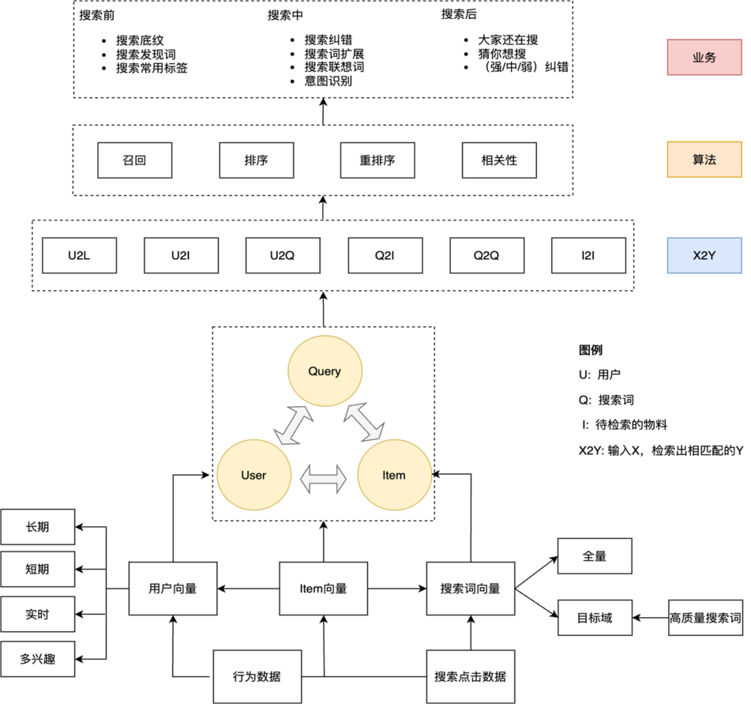 以快看搜索场景为例,目前在多个场景应用了向量检索技术,搭建了如下的向量召回全景架构: