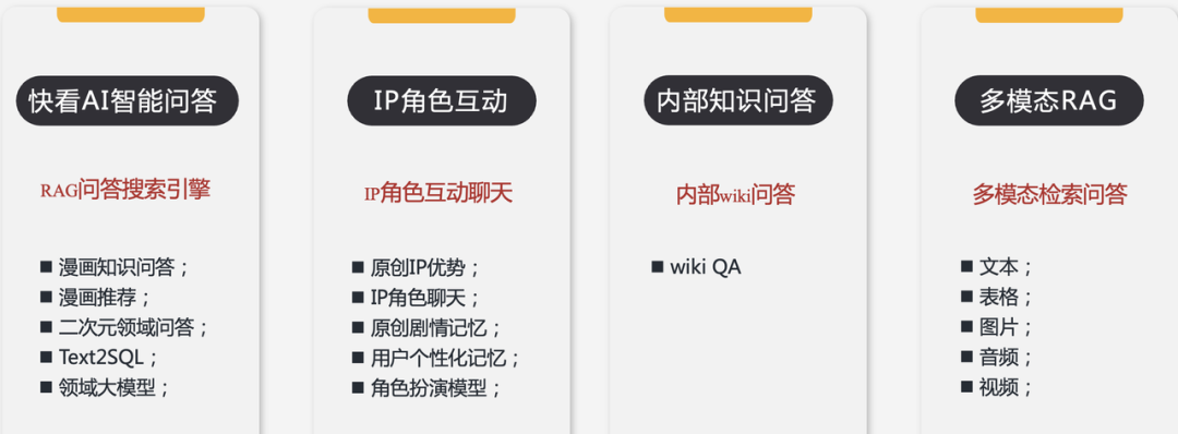 快看在大语言模型及RAG出现之后,迅速切入到以大语言模型为代表的技术领域,开始探索快看内部的应用场景,并在快看AI智能问答、IP角色互动两个场景取得了实质性进展,接下来以这两个场景为例,详细介绍下我们的技术方案。