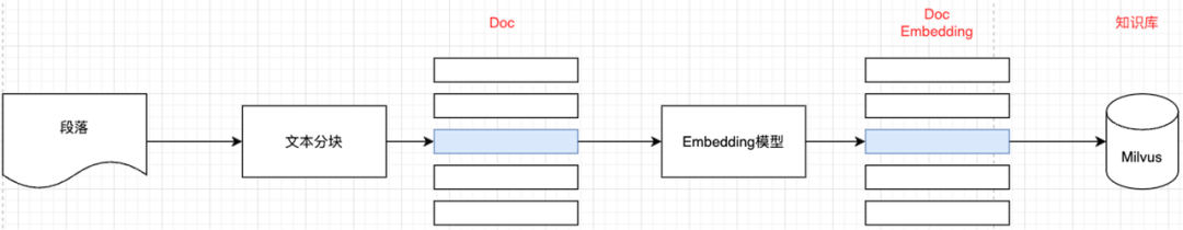 构建知识库的过程就是给文本数据构建索引,首先要基于清洗好的数据切分成不同的chunk块,每个chunk块称作是一个doc,这是构建向量的最小单位,然后使用Embedding模型在doc上编码出向量,存储到Milvus中并建好向量索引,此时一个知识库就构建好了。