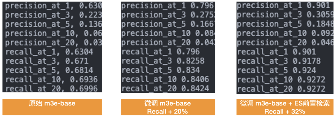 左边的图是最初只使用开源的 m3e-base模型做召回的评测结果,这个结果作为baseline。