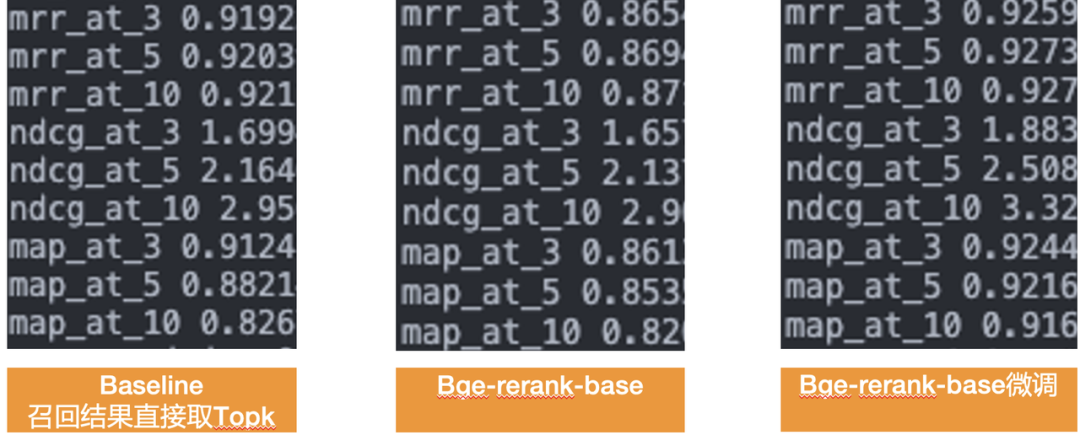 右边的图是对bge-rerank-base模型进行微调后的结果,相比于baseline,map有5%的提升,相比于不微调,map有8%左右的提升。