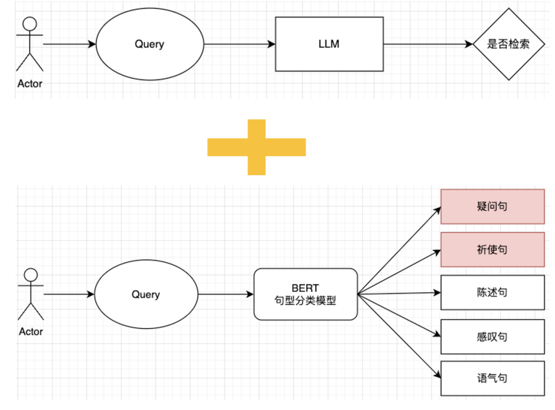 我们目前的做法是先用大语言模型进行判断,会在 prompt中写清楚知识库的范围,这个prompt会写的比较严格,尽量让判断为检索的问题确实是需要检索的。判定为不需要检索的问题,则进行第二关句型维度的判断,我们做了一个假设,就是用户的输入如果是疑问句和祈使句大概率是需要检索的,其它句型如陈述句、感叹句、语气句等,则不需要检索,直接调用大语言模型进行生成即可,为此我们专门训练了一个Bert的句型分类模型。当然,这种做法仅供参考,大家如果有更好的意图识别方案也欢迎交流分享。