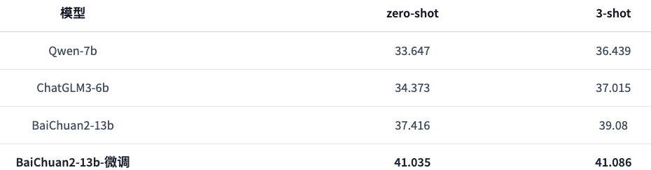 以下是我们基于 Baichuan2-13b大模型微调后的评测结果,分别在zero-shot和3-shot下进行了评估,相比于不微调,均有不同程度的提升。