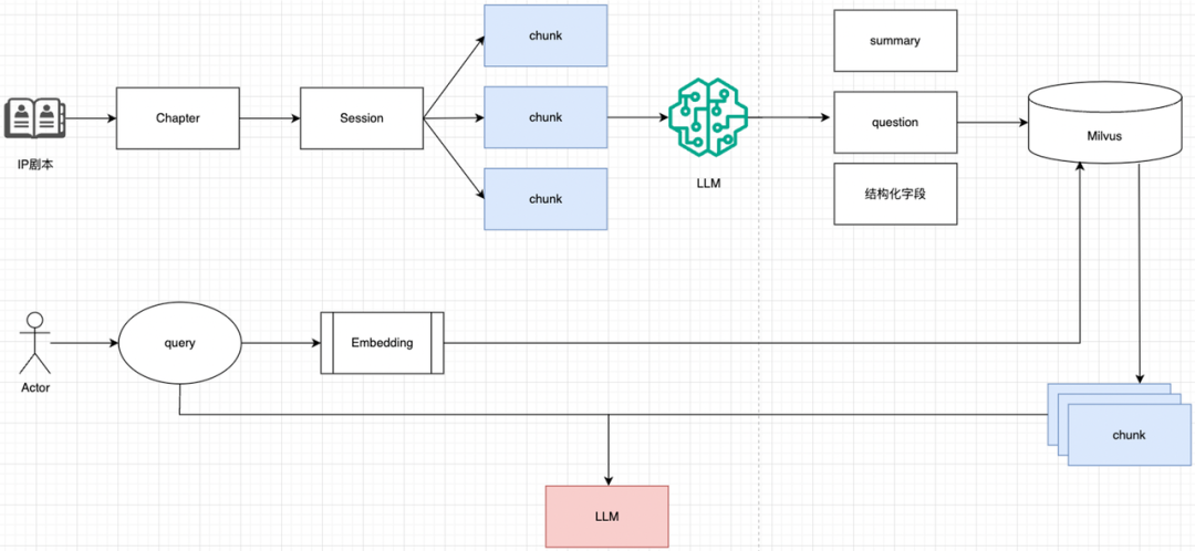 整体RAG方案和上面讲的类似,这里说一下两个知识库的构建策略。首先是剧情知识库,我们会将剧本做三级切分,即chapter-session-chunk,在每个chunk块上利用LLM抽取summary、question以及一些结构化字段,将这些信息构建向量索引存储到 Milvus中作为剧情知识库,但有很多细节要注意,比如脏数据过滤、故事线划分、业务字段过滤、chunk长度、大模型抽取准确性等。